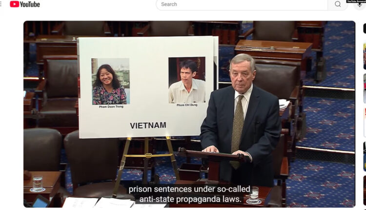 “Chính phủ Việt Nam tiếp tục hạn chế nghiêm ngặt quyền tự do ngôn luận, với quá nhiều nhà báo và nhà bảo vệ nhân quyền phải đối mặt với sự sách nhiễu, giam cầm và nhà tù khắc nghiệt qua những bản án theo cái gọi là điều luật ‘tuyên truyền chống nhà nước’”, vẫn Thượng nghị sĩ Durbin đại diện cho bang Illinois phát biểu, đồng thời đưa ra chân dung của hai nhà báo Việt Nam đang bị cầm tù là ông Phạm Chí Dũng và bà Phạm Đoan Trang.
