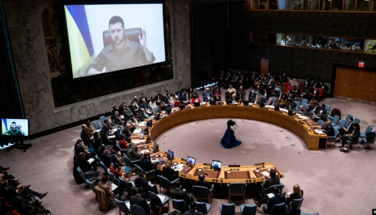 Ảnh: Tổng thống Ukraine Volodymyr Zelenskyy xuất hiện qua video từ Ukraine nói với các thành viên Hội đồng Bảo an Liên hiệp quốc ngày 5/4/2022, về tội ác chiến tranh của Nga tại Bucha.