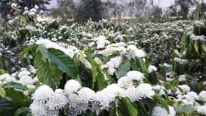 Mảnh đất Đắk Nông thật bí ẩn, dù mới tối hôm trước mưa xối xả cả đêm thì sáng hôm sau trời ráo hẳn. Trận mưa đầu mùa xóa tan bầu không khí nóng bức ngày đầu xuân. Tôi thoáng ngửi mùi của đất hòa quyện với mùi nhẹ dịu của hoa cà phê. Tôi không nhớ bao nhiêu lần cố tình dậy thật sớm để cảm nhận cái mùi hoa thân thuộc đó. Phóng tầm mắt ra sau hè, một bức tranh trắng xóa hiện lên. Tiếng gió đưa nhẹ hương hoa qua mũi, hương vị của đất trời lan tỏa khắp không gian. Khung cảnh tạo nên sự hân hoan bởi hoa nở là dấu hiệu của một mùa bội thu với người dân nơi đây. Nếu có dịp một lần ghé thăm nơi đây đúng dịp hoa nở, bạn sẽ bị thu hút bởi những “cánh đồng” cà phê hoa nở khắp triền đồi, một khung cảnh choáng ngợp thật sự. Đi đến đâu, bạn cũng đắm say trong hương hoa cà phê ngào ngạt.