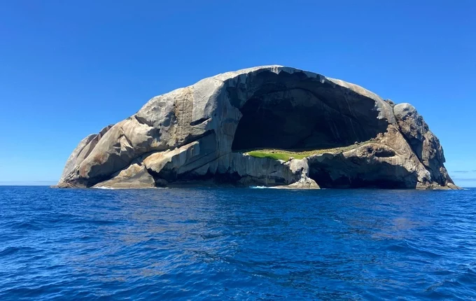 Từ trên bờ nhìn ra xa, hòn đảo giống như một tảng đá bình thường nhô cao giữa những con sóng. Nhưng khi tới gần khu vực phía tây của đảo, du khách sẽ thấy hang động khổng lồ rộng chừng 130m, cao 60m và sâu 60m với thảm cỏ xanh mướt mọc từ ngoài tới tận cuối hang.