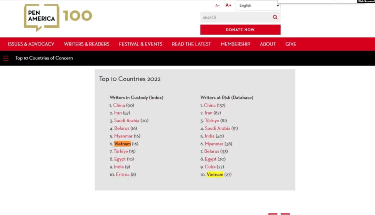 Văn bút Hoa Kỳ (PEN America) vừa xếp Việt Nam vào nhóm 10 quốc gia đáng quan ngại nhất trên thế giới về việc đàn áp các tác giả, nhà báo, với 16 người đang bị chính quyền giam cầm và 27 người đang đối mặt với nguy hiểm, chỉ sau Trung Quốc, Iran, và Ả Rập Xê Út.