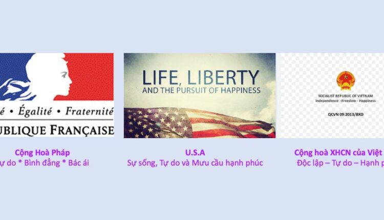 Phương châm của chánh phủ Pháp là ”Liberty, equality, fraternity” (không dùng chữ freedom). Tương tự, bản tuyên ngôn độc lập của Mĩ đề cập đến liberty trong “Life, liberty and the pursuit of happiness.” Việt Nam thời sau khi cướp chánh quyền có lẽ bắt chước Pháp hay Mĩ, nên dùng tiêu ngữ “Độc lập — Tự do — Hạnh phúc”.