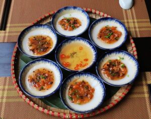 Rồi đến nhân và nước mắm. Tôm tươi hấp, lột vỏ, giã dập, chấy mịn với chút nước mắm. Mỡ hành xanh mướt, da heo chiên phồng giòn rụm. Mắm chấm pha từ nước mắm ngon, nước luộc tôm ngọt thanh, ớt xanh thái lát. Mặn ngọt vừa miệng, cay nhẹ như một nụ cười e ấp.