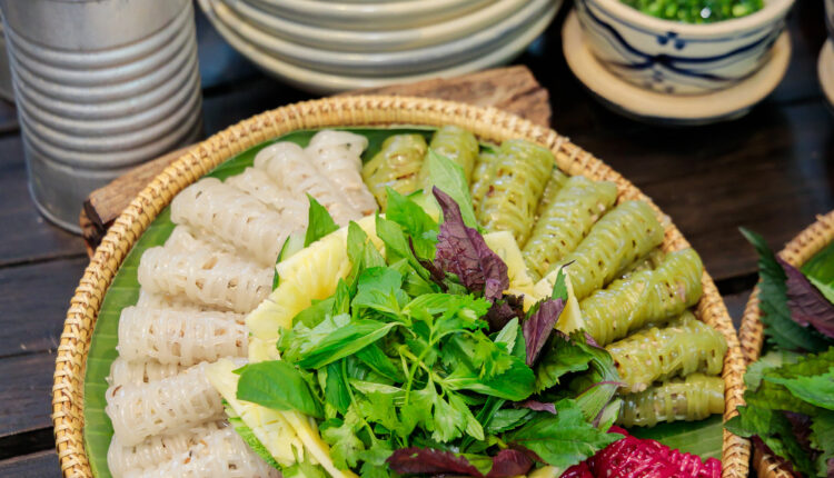 Sang loại bánh lá dứa gân còn bất ngờ hơn. Đầu bếp sẽ bào mỏng củ khoai môn, tạo hình thành những sợi dài, dẹp (dày cỡ que tăm) rồi mang phơi 1 – 2 nắng. Lấy chúng, trộn với bột gạo cùng nước cốt lá dứa và rất ít đường để tạo nên khối “áo” bột màu xanh tím bên ngoài. Còn phần nhân vẫn là, ruột đậu xanh được hấp chín sẵn, vò thành từng viên tròn nhỏ cỡ ngón chân cái người lớn.