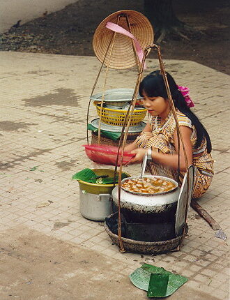 Huế có nhiều gánh bún dạo. Từ tờ mờ sáng cho đến xế chiều, nơi nào ở Huế cũng dễ dàng bắt gặp những gánh bún dạo của các mẹ, các chị từ ngoại thành đổ vào. Mỗi gánh bún, ngoài những dụng cụ phổ biến như bao gánh hàng rong khác như tô, đũa, muỗng, bếp lò… cần phải có một cái nồi nấu bún. Đó là chiếc nồi có dung tích khoảng 10 lít, dáng tựa cái niêu đất nhưng được làm bằng nhôm. Theo lời những bà hàng bún kỳ cựu ở cố đô thì cái nồi nấu bún ngày trước được làm bằng đất nung, đáy tròn, cổ eo, miệng loe. Nồi này sâu lòng nhưng nhỏ miệng nên giữ nhiệt rất tốt. Đáy nồi tròn để khi bán gần hết, người ta nghiêng nồi cho dễ, khỏi chông chênh trên bếp và đặc biệt là rất dễ múc nước bún, cho dù đó là tô cuối cùng. Đầu thập niên 1960, ở Huế xuất hiện loại nồi tròn làm bằng nhôm, hình dáng tương tự chiếc nồi đất ngày trước. Nhôm dày nhưng nhẹ và bền, nên loại nồi này nhanh chóng trở thành loại nồi nấu bún chuyên dụng và không gì thay thế được, và được mẹ con bà hàng bún “truyền thừa” từ đời này sang đời khác. Nhiều cái nồi dùng lâu đã thủng, nhưng vẫn được gò vá để dùng, chứ không ai muốn dùng loại nồi khác. Vài khách sành ăn bún còn cho rằng tô bún được múc từ một loại nồi khác sẽ không ngon, nên họ luôn cố tìm gánh bún nấu trong chiếc nồi xưa để ăn.
