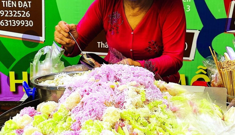 Riêng bánh tằm dai được làm từ bột năng và cô Ba đánh dấu bằng màu hồng tím. Ai thích loại nào, cô Ba lấy loại đó nhưng khi trộn chung thì có cái thú ngon riêng.