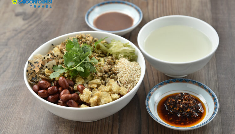 – Cho rau thập cẩm vào tô, trộn với vài ba muỗng canh đầy hến xào. Chan nước luộc hến nóng vào tô.