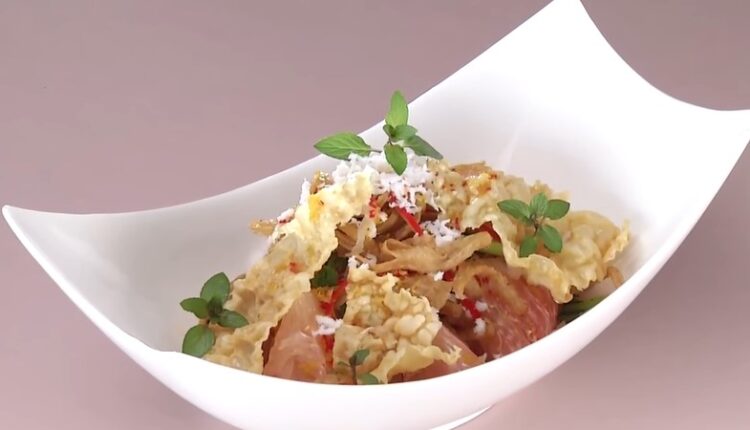 Thịt bưởi trộn với cơm dừa nạo cho ra một món gỏi vừa ngọt ngọt, vừa chua chua, vừa béo béo. Ngọt vì độ Brix – đơn vị tính độ ngọt – của bưởi là 10,5 – 11°Bx, tức là cứ một ký thịt bưởi có từ 105 – 110g đường. Độ chua chỉ có 0,3 – 0,35g. Chua dịu dàng như nàng dâu những năm đầu về nhà chồng. Để đáp ứng khẩu vị của từng người về độ hảo béo, nhứt là những khách chưa miền Tây mấy, chưa Bến Tre bao nhiêu, không nên trộn thịt bưởi với cơm dừa một lần. Khi dọn gỏi nên bày bưởi với dừa riêng. Ai thích béo nhiều thì trộn nhiều dừa… Nhưng đó là món gỏi chưa hoàn hảo vì thiếu cái mặn mà, cái cay, cái ngọt thanh tân của đạm, mà một mình nước mắm chưa đủ xinh để… đứng đầu đình. Chính món cá cơm sông một nắng nửa chiên nửa rang với nhiều ớt, mắm ngon. Chiên loại cá này dễ động lòng hàng xóm và người trong nhà sặc sụa vì ớt xộc cay vào mũi. Nhà có máy hút mùi ở bếp là hay nhất. Rồi còn phải là cá cơm sông con cỡ ngón tay út. Cá cơm trỏng một nắng – cỡ ngón tay cái – sẽ không dòn, nên làm món gỏi mất một đặc tính. Cuối cùng đừng quên rau gia vị – thứ giúp ta thưởng thức cái ngon thêm bằng lỗ mũi. Đó là một dĩa gỏi bưởi hoàn hảo, và rất ư nhà quê.