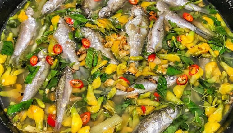 Ngay từ tên món ăn chúng đã đoán được 2 loại nguyên liệu chính của nó, là những con cá linh bé xinh và bông điên điển có sắc vàng rực.