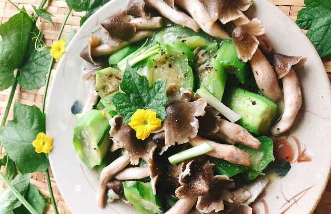 Từ nấm, người ta biến tấu được nhiều món ngon, nhưng tôi vẫn thích nhất món nấm mối nấu nui. Mạ tôi thường luộc nui trước cho mềm, rồi bà lấy ít tôm ướp sẵn các gia vị tầm 30 phút cho thấm. Tôm thấm gia vị, mạ bỏ lên xào qua cho tôm chín đều. Khi nui bắt đầu mềm, bà hạ lửa nhỏ rồi chêm thêm nước, đổ phần tôm vừa xào sơ vào chung với nui. Sau khi nêm nếm thấy mọi thứ đã vừa miệng, mạ đổ rá nấm lên rồi để lửa nhỏ tầm 5 phút. Để nấm ngon thì không được nấu quá chín. Món nấm nấu nui của mạ bao giờ cũng cho tôi cảm giác vừa miệng, dai ngọt, mềm mại kèm một chút hương vị đồng quê từ tôm đất.