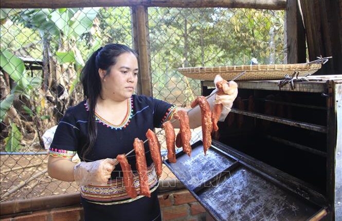 Thịt heo gác bếp ở đây có vị khác so với nhiều nơi là do thịt được hun dưới củi cây cà phê, bã mía vì vậy có vị đặc trưng của vùng đất Tây Nguyên đại ngàn. Tết là thời điểm mọi người sum vầy bên nhau sau một năm lao động vất vả. Với người Jrai, Tết là thời gian kết nối cộng đồng, đồng bào quây quần bên mái nhà Rông, cùng thưởng thức hương rượu cần, món thịt heo gác bếp đậm đà…