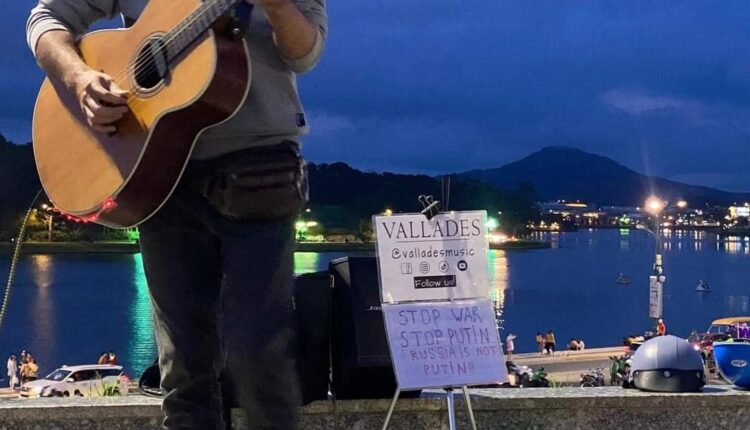 Ảnh: Propisnov Alexander hát tại quảng trường Lâm Viên ở Đà Lạt, cạnh biểu ngữ phản đối Putin xâm lược Ukraine/ facebook