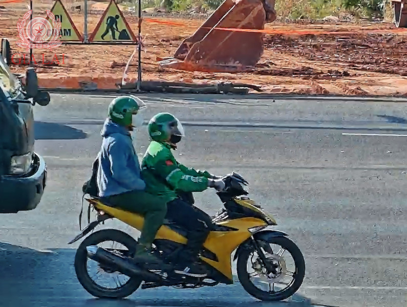Hai đối tượng là nam giới, mặc áo khoác, đội mũ bảo hiểm màu xanh giống tài xế Grab, sử dụng xe mô tô mang theo một túi xách màu xanh, đi vào Vietcombank trên đường Trường Chinh.