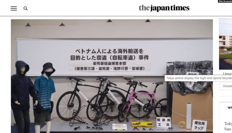 Cảnh sát Tokyo vừa bắt giữ hai công dân Việt Nam với cáo buộc ăn trộm xe đạp thể thao cao cấp trong vụ án mới nhất liên quan đến một loạt vụ trộm xe đạp đắt tiền nhằm mục đích tháo ra rồi bán lại ở Việt Nam, các trang Kyodo News và The Japan Times đưa tin hôm 11/7.