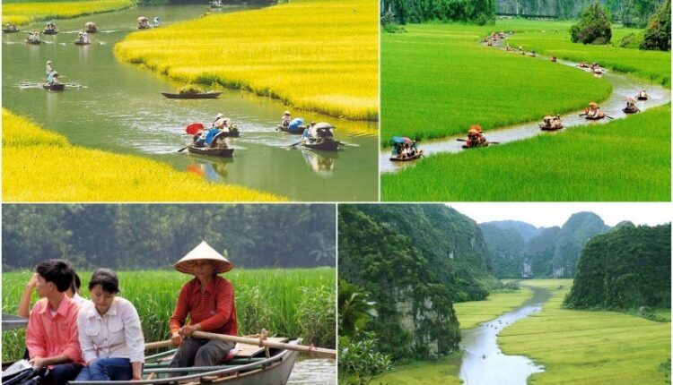 Đặc biệt nếu đến Tam Cốc Bích Động vào cuối tháng 5, đầu tháng 6, bạn sẽ được chiêm ngưỡng cảnh sắc rực rỡ của cánh đồng lúa trổ đòng đòng. Các cánh đồng lúa hai bên sông kết hợp hài hòa giữa sắc xanh của mạ non và vàng rực của lúa chín tạo nên bức tranh hoàn hảo của cảnh sắc non sông, khiến bất cứ ai cũng phải bồi hồi, xao xuyến.