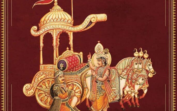 “The Illustrated Mahabharata” cho biết: “Vào ngày cuộc chiến Kurukshetra bắt đầu, Arjuna nhìn các đối thủ của mình đang dàn hàng phía bên kia chiến tuyến và nhận ra tất cả đều là những người trong gia tộc hoặc những người bạn của chàng. Nhận thức được rằng sát hại những người thân gần gũi nhất của mình để làm chủ một vương quốc là chống lại hành động đúng (dharma), chàng hạ cung xuống và muốn rời bỏ cuộc chiến. Khi Krishna – người bạn, người cố vấn và người đánh xe ngựa – thấy lòng Arjuna tràn đầy nghi hoặc và muốn từ bỏ cuộc chiến đấu, ông nhắc chàng chiến sĩ nhớ lại những bổn phận của mình, nói với chàng rằng chàng sẽ không tạo nghiệp xấu khi tham gia cuộc chiến. Trong cuộc đối thoại này, Krishna bày tỏ cho mọi người thấy ông chính là Thượng đế.